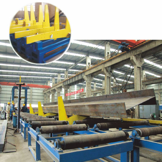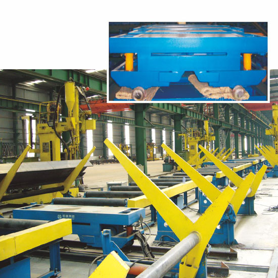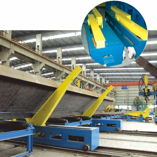 移鋼機(jī) H型鋼組立完畢后,兩臺移鋼機(jī)抬起工件送至60°翻轉(zhuǎn)支架上翻轉(zhuǎn)并焊接。